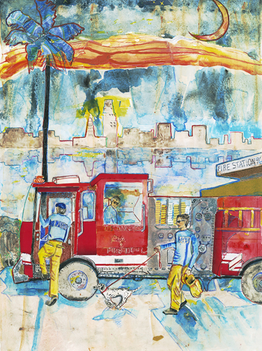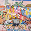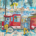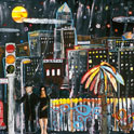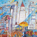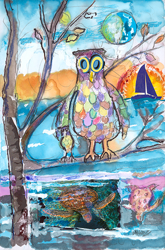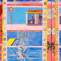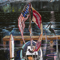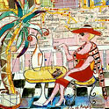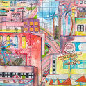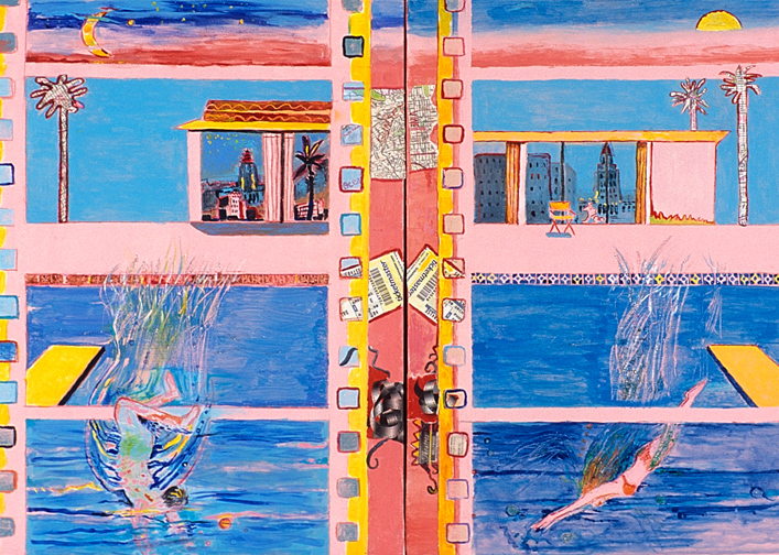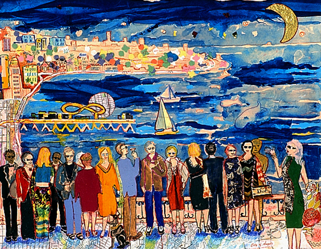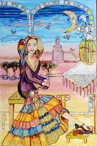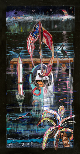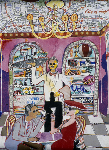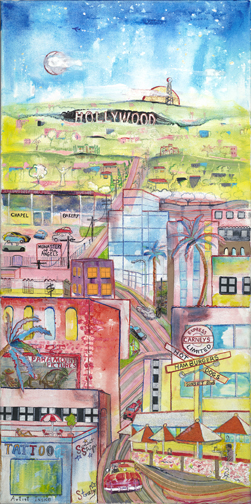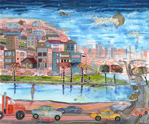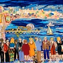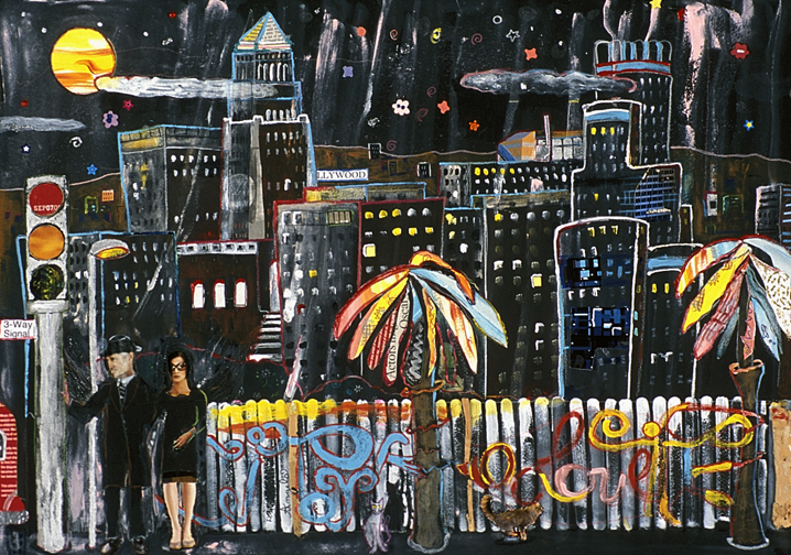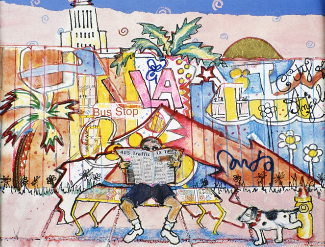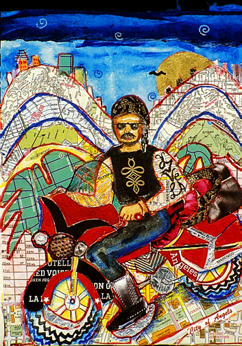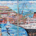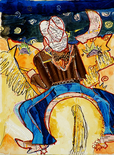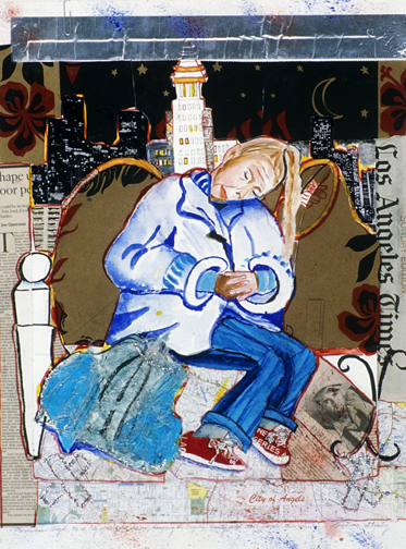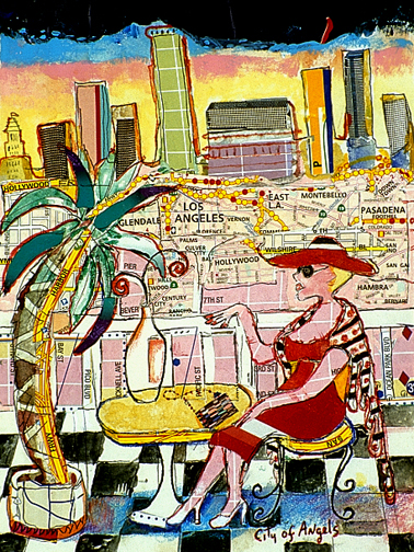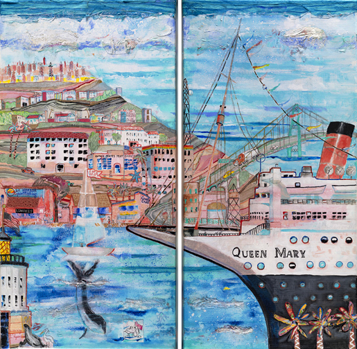 This is LA Harbor--a collage and a montage on canvas. Besides the Queen Mary, you can see San Pedro, and Signal Hill as it used to be. In the lower, left corner is Charlie, the California Harbor Seal, that was the US Coast Guard's mascot during the 60s and was allowed inside the tower. I did this painting as a tribute to my mom who loved San Pedro and